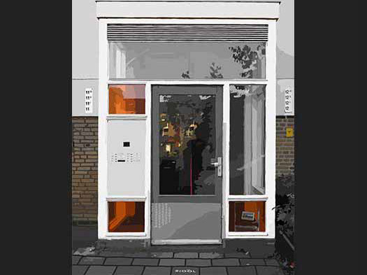 De omlijsting van het raam, in verweerd donker hout, draagt sporen van de tijd en vertelt daarmee verhalen van generaties studenten. Kleine oneffenheden en afbladderende verflagen zijn met zorg weergegeven, waardoor het digitale kunstwerk een gevoel van geschiedenis en karakter ademt. Achter het glas suggereert een zachte gloed het levendige leven binnen de sociëteit, zonder dat iets van het interieur zichtbaar is.