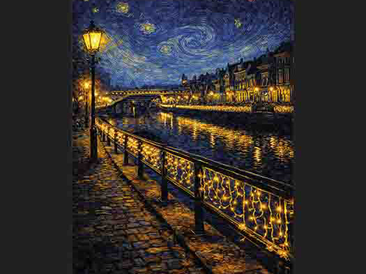 "Le Phare, Honfleur" is een digitaal kunstwerk dat de betovering van een heldere nacht vastlegt. In het centrum torent een elegante vuurtoren omhoog, zijn stenen structuur scherp omlijnd tegen de diepe nachthemel. Bovenin stralen krachtige lichten naar alle kanten uit, hun bundels snijden door het donker en baden de omgeving in een zacht, mysterieus schijnsel. Hoog boven alles werpt de volle maan haar zilveren licht over het stille landschap, waardoor het geheel een bijna droomachtige sfeer krijgt.