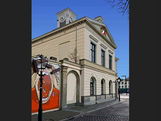 "Achter de Dom" is een digitaal kunstwerk dat een stilleven van een Utrechtse straat vastlegt, badend in zomers licht. De compositie toont de historische sfeer van de stad met links een rij oude huizen, opgetrokken uit warme, bruine bakstenen. Hun verweerde gevels en kleine stoepjes ademen een gevoel van tijdloosheid en rust. Rechts contrasteert een serie gele gebouwen subtiel met het donkerder palet van links; hun lichtere tinten reflecteren het zonlicht en brengen het beeld in balans.