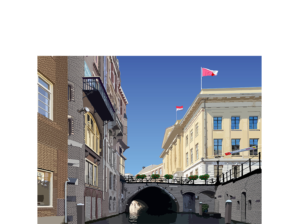 Paushuize is een digitaal kunstwerk dat de rijke historie van Nederland op indrukwekkende wijze vangt. Het beeld focust op het iconische Paushuize, een statig gebouw dat herinnert aan de tijd dat Nederland zijn eigen paus kende: Adrianus VI. Rechts in de compositie torent het monumentale gebouw krachtig omhoog. De gevel is gedetailleerd en vol grandeur, met twee sierlijke lantaarns die boven de openstaande, uitnodigende deur hangen. De deuropening werpt een warme schaduw naar voren, alsof het verleden zelf de toeschouwer binnen wenkt.