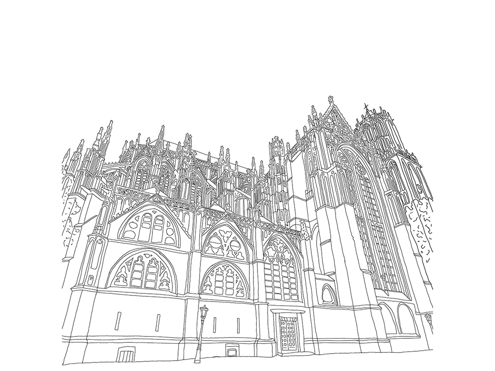 Dominant in het beeld is de glazen techniektoren, die als een transparant baken uit de structuur oprijst. De toren weerspiegelt de lucht en vormt een eigentijds contrapunt binnen het verder ingetogen silhouet van de achtergevel. Door het gebruik van digitaal licht en schaduw wordt de toren subtiel geaccentueerd, wat het verticale karakter van het gebouw versterkt.