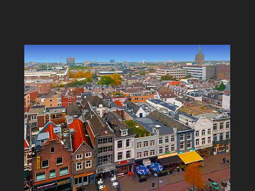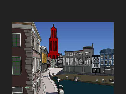 Op de achtergrond ontvouwt zich een subtiel stadsgezicht: de contouren van enkele historische gebouwen in de Domstraat zijn zichtbaar, in zachte lijnen en tinten die diepte suggereren zonder op de voorgrond te treden. Bij nadere beschouwing is, haast verborgen, het beeld van Bonifatius te paard te herkennen, als een stille verwijzing naar de religieuze en culturele lagen van de stad. Daarnaast staat de Janskerk, met zijn sobere maar statige silhouet, gedeeltelijk verscholen achter de architectuur, wat bijdraagt aan de gelaagdheid van de voorstelling.