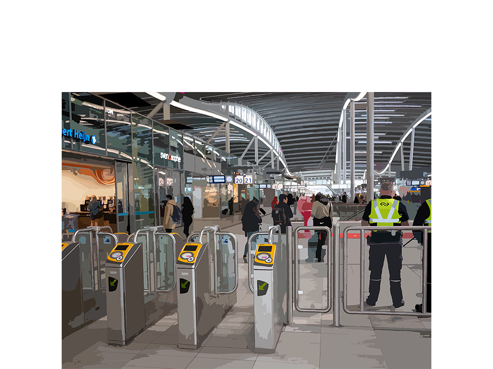Achterin rijst de imposante Domtoren op, zijn silhouet strak en gestileerd getekend tegen de blauwe hemel. Naast de toren is de Domkerk zichtbaar, eveneens vereenvoudigd, met nadruk op haar kenmerkende vormen en lijnen. Het geheel ademt een kalme, bijna tijdloze sfeer, waarin architectuur en kleur samenkomen in een harmonieus, grafisch beeld. Door de afwezigheid van mensen krijgt de omgeving iets verstilds, als een momentopname van een zomerse ochtend in Utrecht.