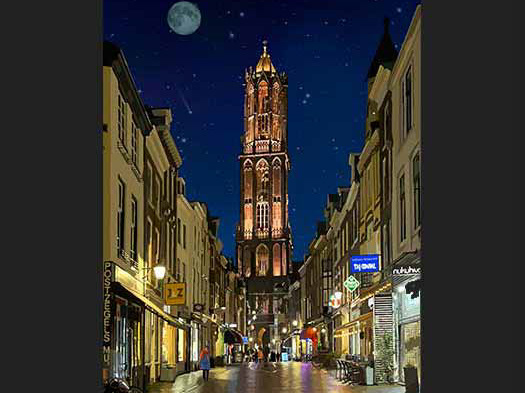 Het digitale kunstwerk toont een gestileerd interieur van de St. Catharinekathedraal, zonder menselijke aanwezigheid, en ademt een serene, bijna tijdloze sfeer. Op de voorgrond ligt een deel van een rijkversierd, vermoedelijk Perzisch tapijt, waarvan de diepe rood- en blauwtinten subtiel contrasteren met de grijze stenen vloer eromheen. Deze vloer oogt niet egaal, maar heeft een levendige structuur van lichtere en donkere plekken, alsof hij de sporen van eeuwen geschiedenis draagt. Links en rechts staan twee imposante, donkere houten banken, fraai gebeeldhouwd met gotische motieven die schaduwrijke details toevoegen aan het beeld. Verder naar achteren verschijnen enkele eenvoudige houten stoelen, naast elkaar opgesteld, en opnieuw links en rechts twee kerkbanken, die samen een doorgang creëren naar het altaar. Het altaar zelf is sober maar centraal geplaatst, met daarop twee slanke kaarsenstandaarden die symbool staan voor licht en devotie. De bovenste helft van het kunstwerk wordt gedomineerd door hoge, gebrandschilderde ramen die warme kleuren doorlaten en patronen werpen op de vloer. Deze muren zijn wit en leiden visueel omhoog naar een gewelfd plafond, dat de ruimte een verheven, haast hemelse uitstraling geeft. Onder de ramen staan negen heiligenbeelden, waarschijnlijk apostelen, statig opgesteld en elk met hun eigen karakteristieke houding en attribuut. Het geheel combineert strakke vormen met subtiele texturen en kleuraccenten, waardoor een harmonieus evenwicht ontstaat tussen devotie, kunst en architectuur. Dit digitale kunstwerk vangt zo de essentie van een sacrale ruimte in een eigentijdse, visuele interpretatie.