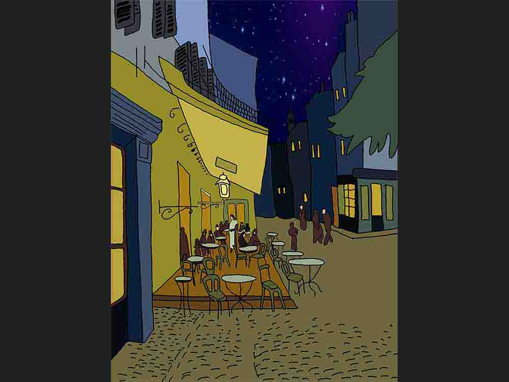 Rondom de woning slingert een gestileerd grindpad, grijs en grafisch weergegeven, dat het gebouw als een sierlijk kader omringt. Achter het huis torent een grote boom omhoog, zijn kruin breed en statig, waardoor een gevoel van geborgenheid en verbondenheid met de natuur ontstaat. De combinatie van architectuur, landschap en lucht maakt het kunstwerk tot een stille ode aan een plek waar geschiedenis en eenvoud samenkomen, gevangen in een harmonieuze, digitale compositie.