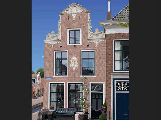 Opvallend zijn de dikke, zwarte contourlijnen die het gezicht en de kleding van het meisje omlijnen. Deze lijnvoering doet denken aan glas-in-loodkunst of pop-artstijl en geeft het werk een grafische, bijna stripachtige uitstraling. Het gezicht van het meisje is opgebouwd uit abstracte kleurvlakken die subtiel variรซren in tint en textuur, wat zorgt voor een vibrerend en gelaagd effect. Haar brede glimlach en fonkelende ogen vormen het stralende middelpunt van het werk.