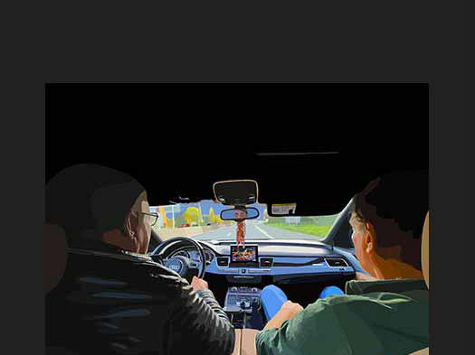 De man draagt een platte pet en een bril, en zijn expressie is kalm en licht glimlachend. Hij kijkt rechtstreeks naar de toeschouwer terwijl hij een klein glas naar zijn lippen brengt. De lijnen en vlakken zijn scherp afgebakend, wat doet denken aan cloisonné-techniek of een topografische kaart. Deze digitale benadering abstraheert de werkelijkheid op een manier die tegelijk herkenbaar en vervreemdend is.
