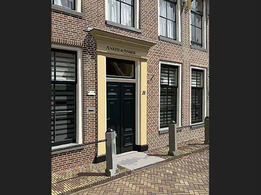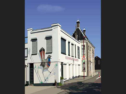 De achtergrond bestaat uit een blauw gebouw met grote vensters en een openstaande deur, wat diepte toevoegt aan het beeld. De dominante kleurtonen zijn blauw en rood, wat zorgt voor een visueel aangenaam contrast en een zomerse sfeer suggereert.