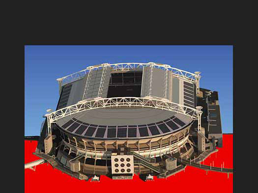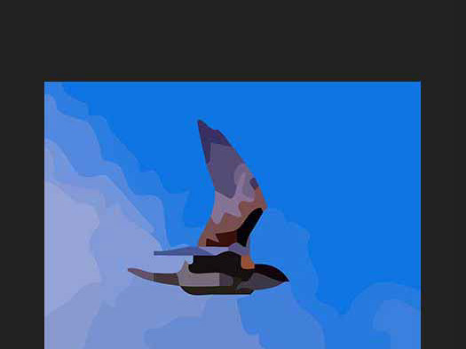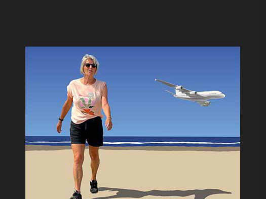 Opvallend is de combinatie van abstracte en realistische elementen. De grote groene en grijze vlakken aan de linkerkant verwijzen mogelijk naar het landschap of stedelijke structuren, maar hun hoekige vorm en felle kleurcontrasten maken het beeld grafisch en gestileerd. Aan de rechterzijde reflecteert het water de contouren van het vliegtuig, waardoor een subtiel spel ontstaat tussen lucht en aarde, tussen werkelijkheid en reflectie.