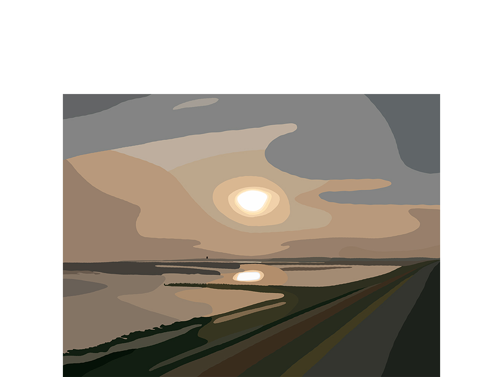 Dit digitale kunstwerk toont een serene en bijna minimalistische weergave van de Baie de Somme, een kustlandschap in Frankrijk dat bekendstaat om zijn natuurlijke schoonheid. De compositie is opgebouwd in horizontale kleurvlakken: een heldere blauwe lucht met drie zachte, witte stapelwolken zwevend in de bovenhelft; daaronder een donkere, groene strook die de bosrand of kwelders voorstelt; vervolgens een brede, beige zandvlakte; en ten slotte een kalm, blauw wateroppervlak op de voorgrond.