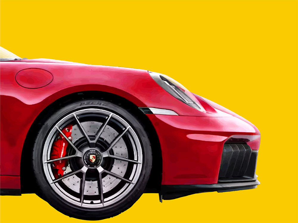 Dit digitale kunstwerk vangt de essentie van een droom: een sportwagen die niet rijdt, maar lijkt te ademen in kleur en vorm. Het vooraanzicht van de felrode Porsche doemt op als een modern icoon, gehuld in een zee van effen geel. De achtergrond, leeg en intens, vormt geen decor maar een podium waarop de wagen tot symbool wordt verheven. Rood en geel – passie en energie – botsen en versmelten tot een beeld dat brandt in het oog.