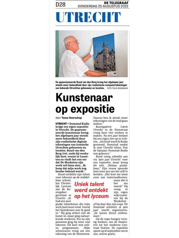 Ruud, ook wel Rudie, bepakt met allemaal apparatuur en stapeltjes papier loopt de Musketon binnen, waar achter in de ruimte, twintig van zijn kunstwerken hangen. Het lijken net foto’s maar hoe dichterbij je komt, hoe beter je ziet dat het allemaal getekend is. Digitaal weliswaar maar allemaal zeer gedetailleerd. De tentoonstelling bestaat uit tekeningen van wat Ruud een aantal van de mooiste plekken van Utrecht vindt. Geboren en getogen in Utrecht kan je wel stellen dat hij hier zeker verstand van heeft. “Wat ik zie wil ik mooier maken” luidt een van zijn uitspraken. Vandaar ook de titel De Domstad schittert al 900 jaar. Ruud tekent al zijn hele leven maar heeft tijdens de corona periode zijn passie weer opnieuw mogen ontdekken. “Ik begon weer met pen en papier, maar dat ging helemaal niet. En toen ontdekte ik een teken app op de iPad en daar teken in mee.” Het begon allemaal met portretten van zijn vrouw en kinderen en af en toe tekende hij ook de Domtoren. Dit omdat zijn schoonzoon Jurrit (RB) helemaal gek is op wat met de Dom en met Utrecht te maken heeft. Af en toe lopen er nog mensen langs die vol verwondering naar Ruuds tekeningen kijken. Het zijn beelden die mensen die uit Utrecht komen herkennen. Hoog Catharijne waar je kunt winkelen tot je een ons weegt, Stadsschouwburg wat volgens Ruud voor vele een doorn in het oog is sinds het glazen gedeelte aangebouwd is en de Geertekerk waar de lichtval zo geel was dat dit terug te zien is in de tekening, zijn voor Ruud allemaal plekken met een bijzondere betekenis.