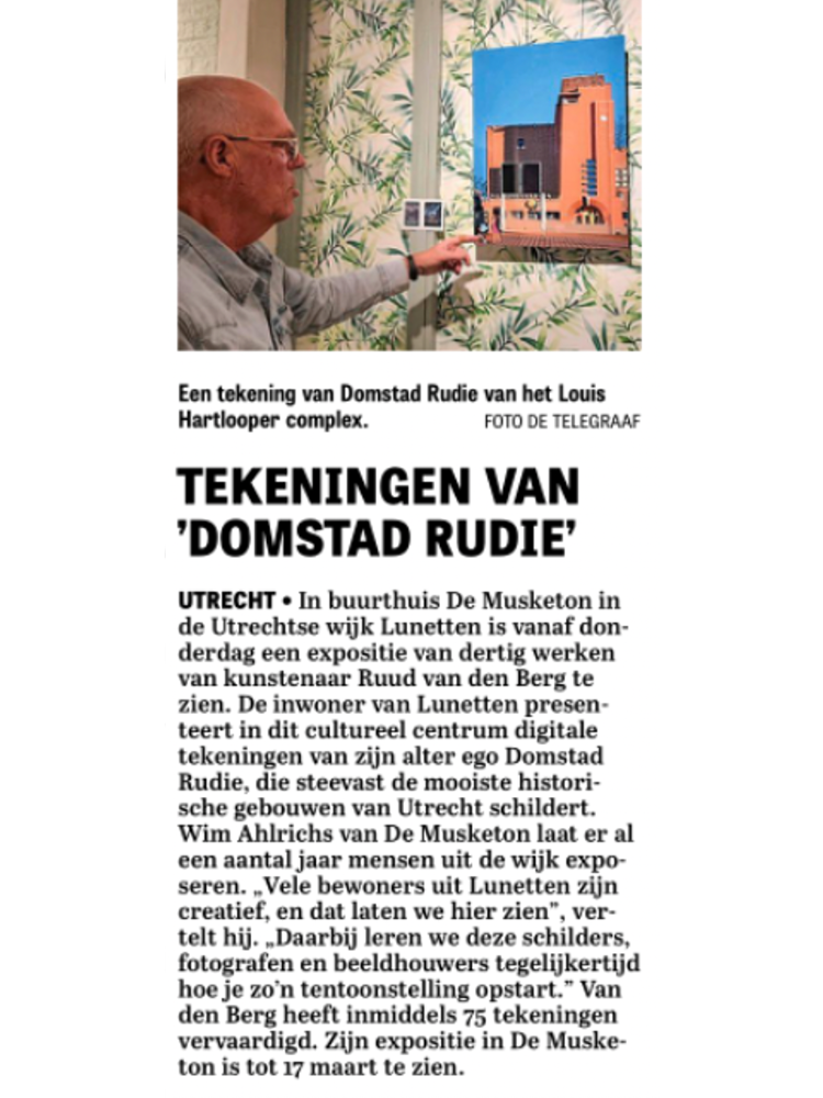 De tekeningen van Domstad Rudie, de alias van Ruud van den Berg, zijn tot 17 maart te zien in buurtcentrum de Musketon. Hij tekent op zijn iPad en gebruikt daarbij het tekenprogramma Adobe Fresco. 'Het gaat uiteindelijk om het resultaat en of dat aantrekkelijk is en dat moeten de mensen maar beoordelen.'Ruud van den Berg tekent al zijn hele leven, vertelt hij. '